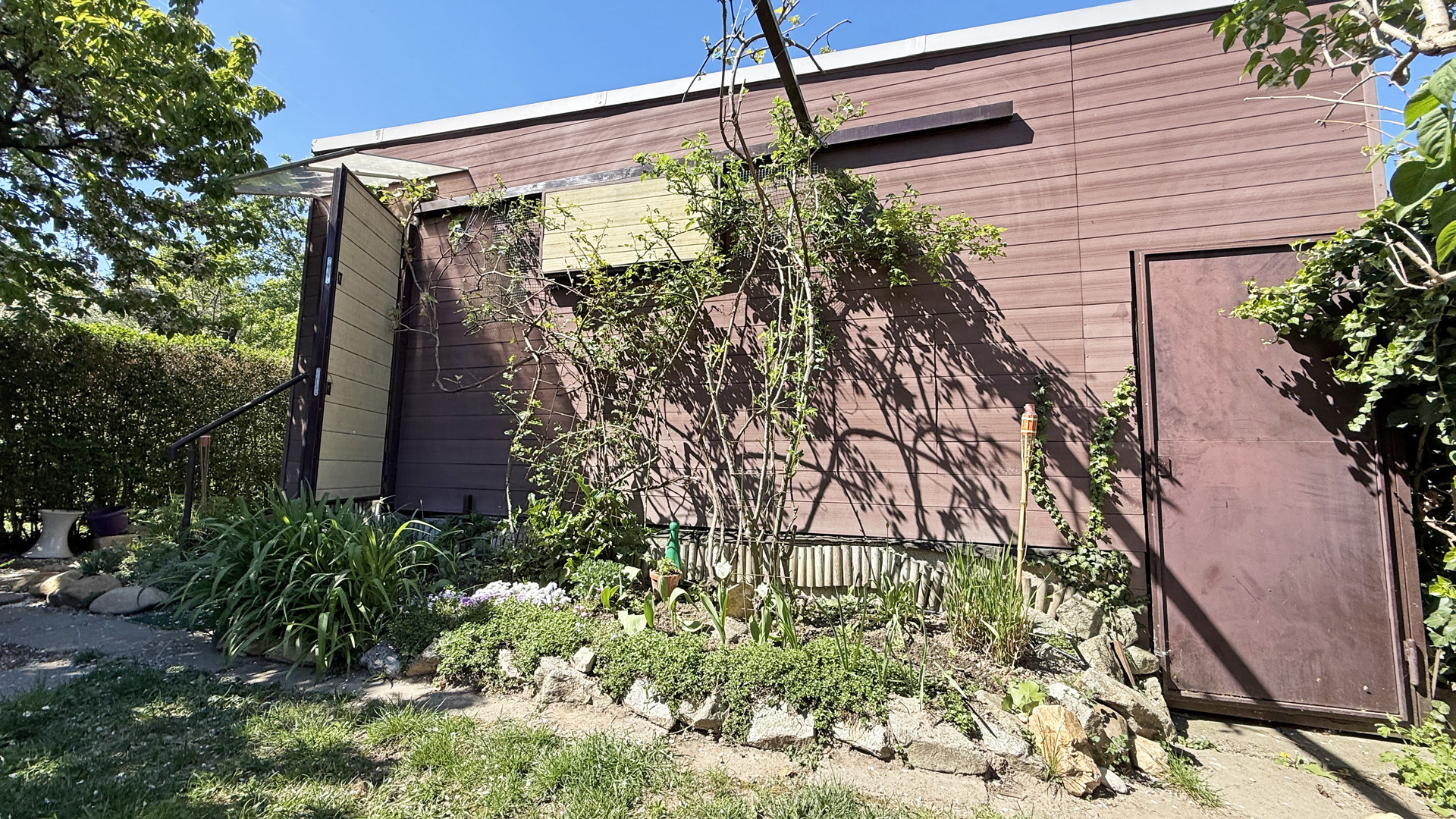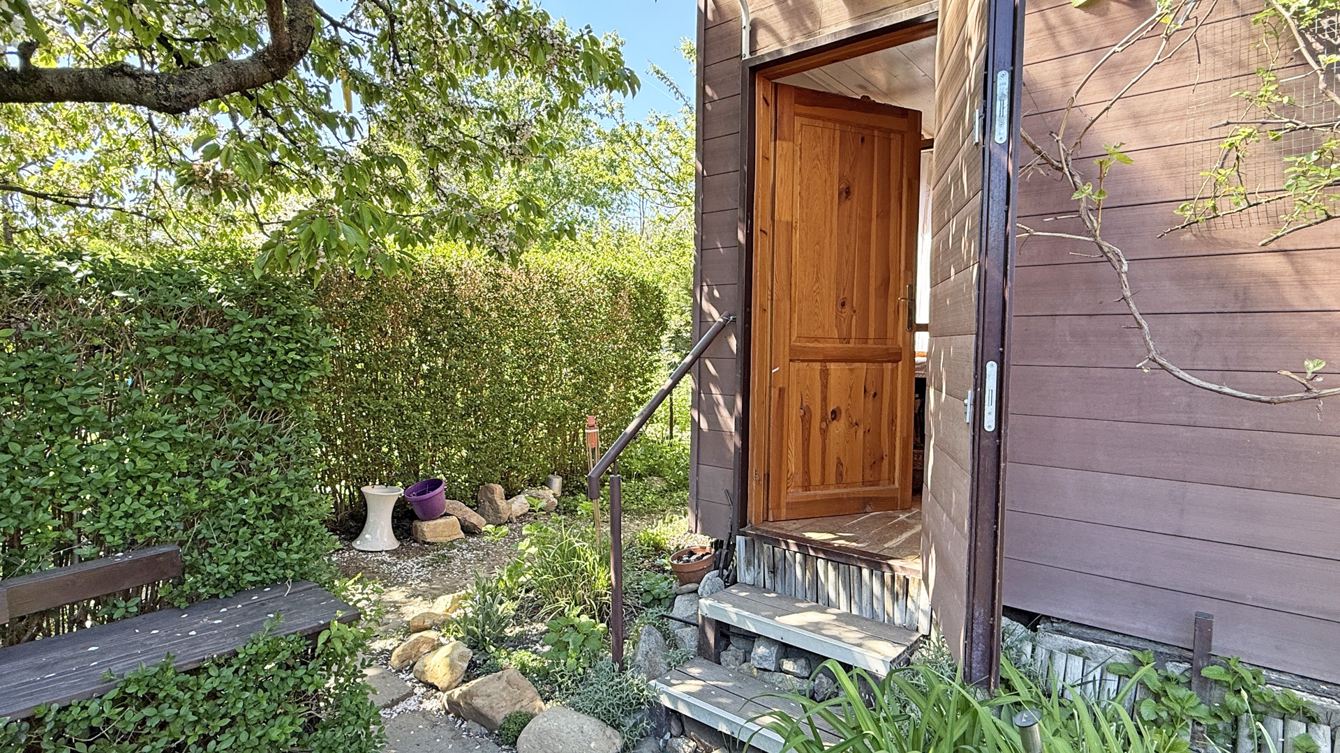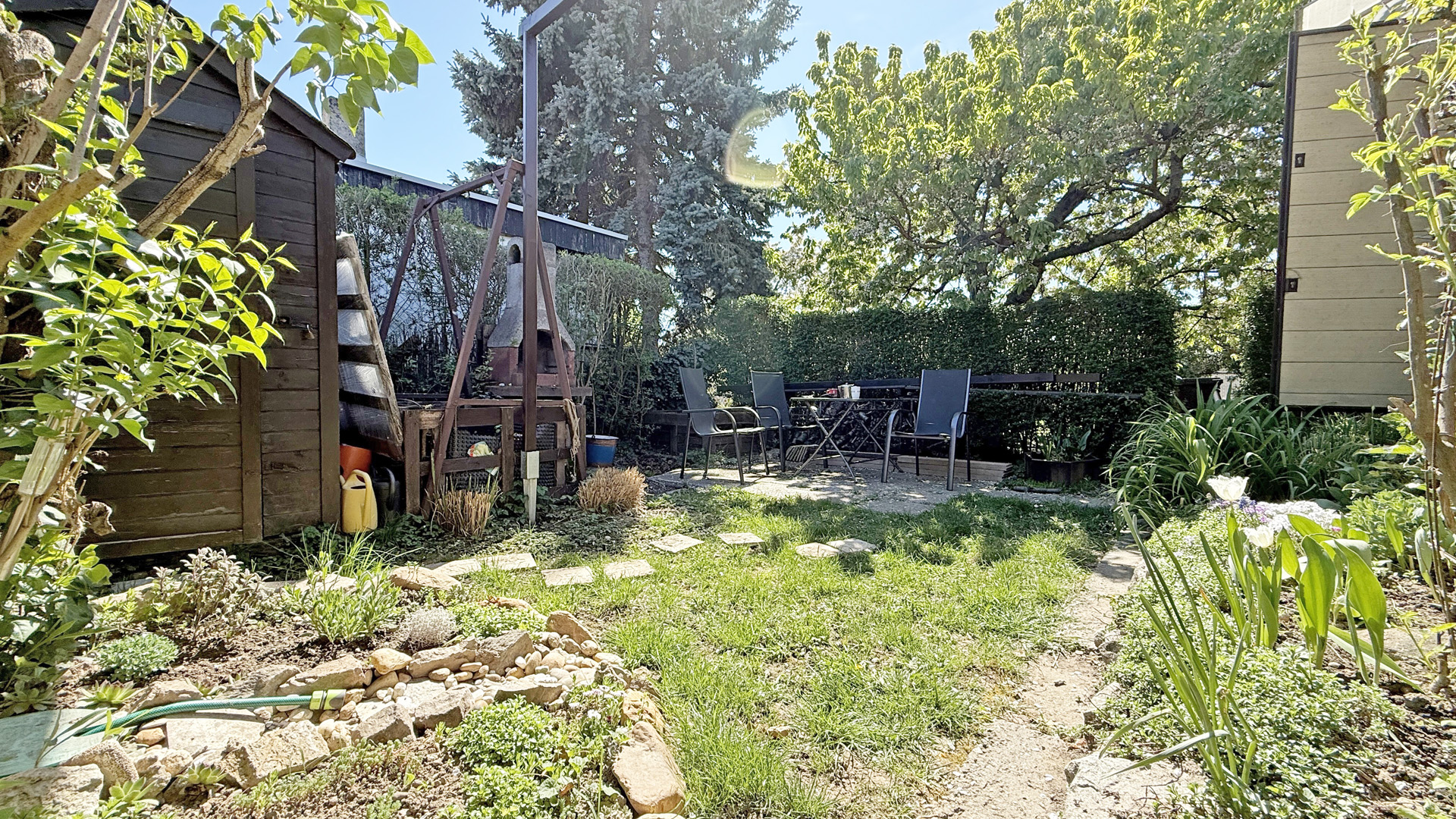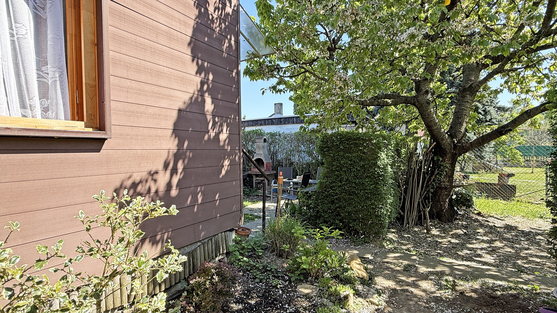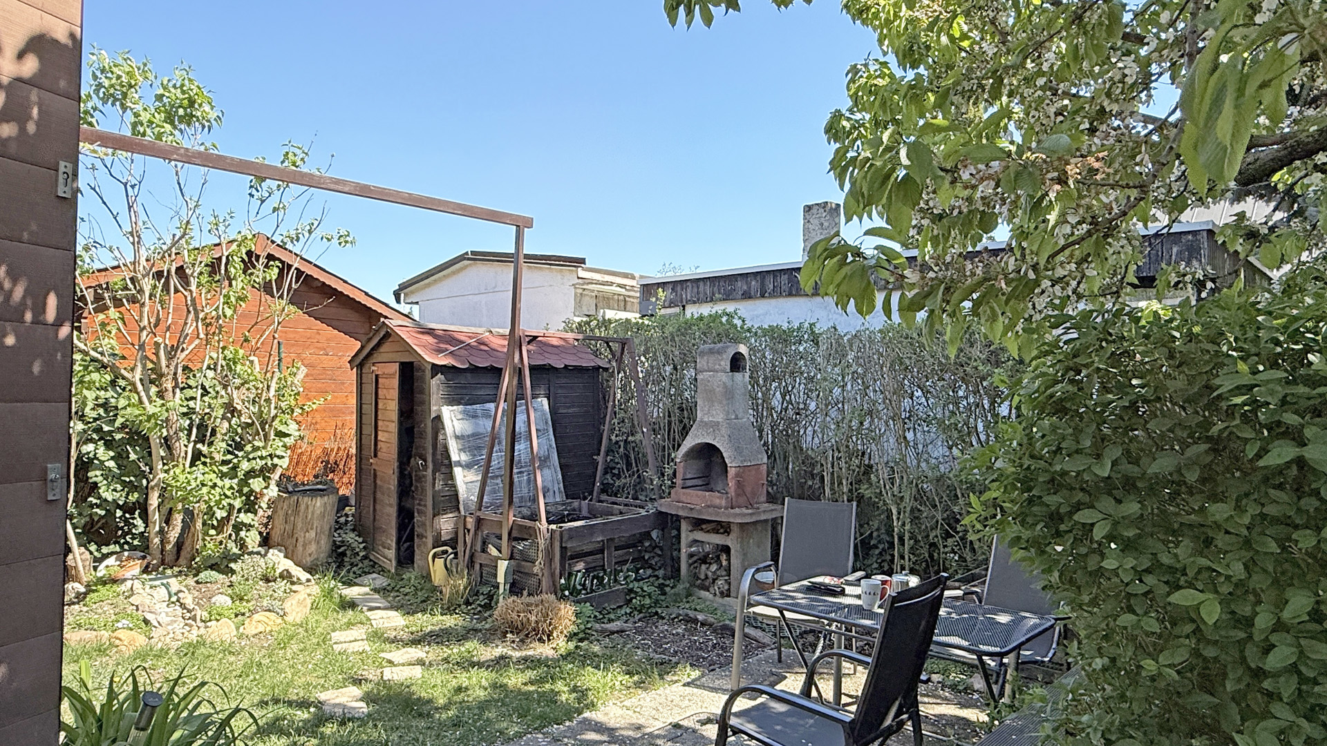 Na pozemku je vonkajší grilovací krb, taktiež drevený domček na náradie.